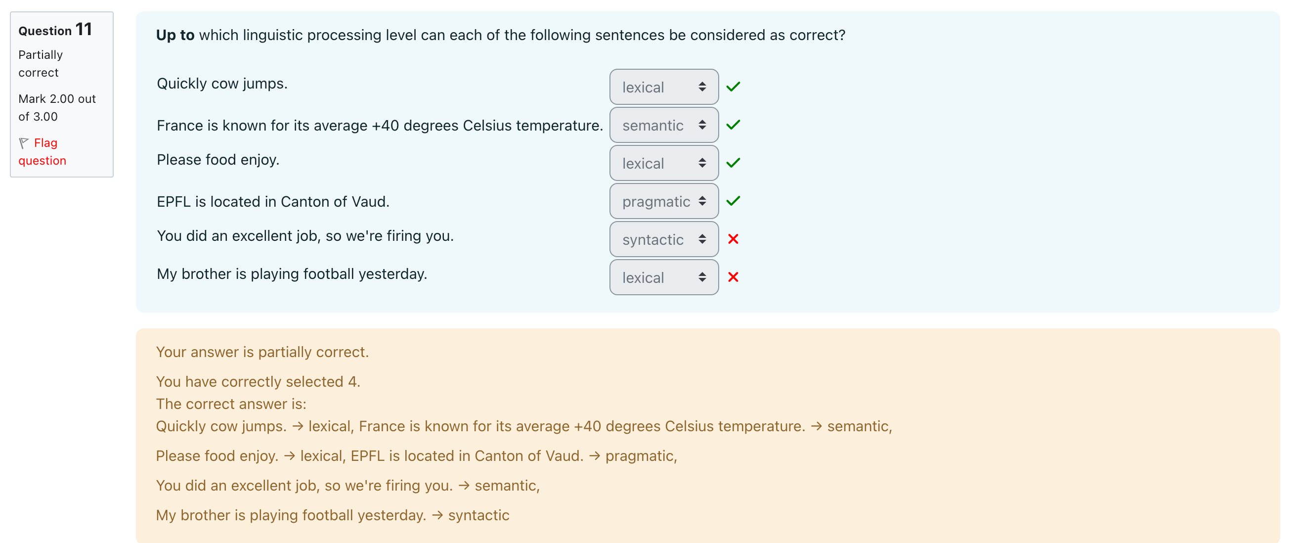 Hi, I have a question about the answer of this question. I think for the last example since it's grammatically wrong and should have used 'was' instead of 'is' the correct answer should be 'lexical' rather than syntactic.