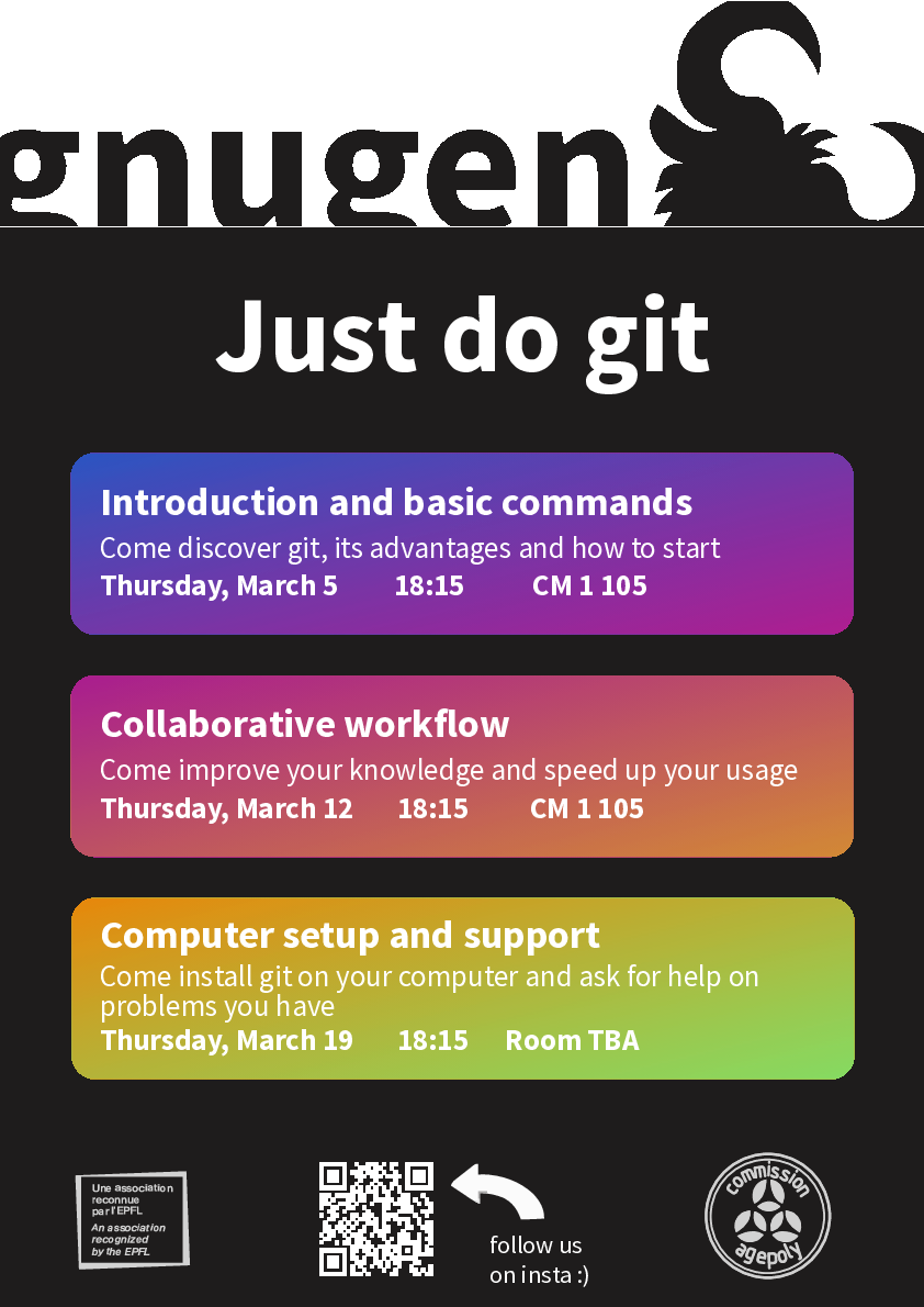 Nous organisons ce semestre à nouveau trois évènements "Just do git" pour permettre aux étudiant·e·s de se familiariser avec git [un outil de partage et suivi de travail collaboratif, en particulier du code]. Chaque présentation sera suivie d'un workshop pour que les étudiants puissent mettre en pratique les commandes présentées.